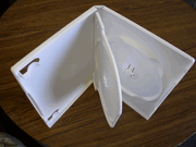| DOUBLE DVD CASE W/SWING(FLIP)TRAY, WHITE, 100 PCS PSD45. CASE DIMENSIONS: 7 3/8" X 5 1/4" X 7/16" HIGH QUALITY DOUBLE DVD CASE W/FLIP TRAY, FRONT HAS TWO LITERATURE CLIPS, SWING TRAY HOLDS ONE DISC, BOTTOM HOLDS ANOTHER DISC, A VERY HIGH END, RARE DVD CASE IN WHITE. |